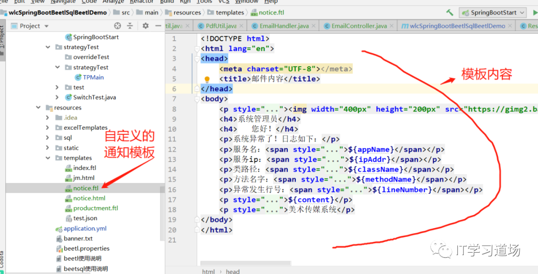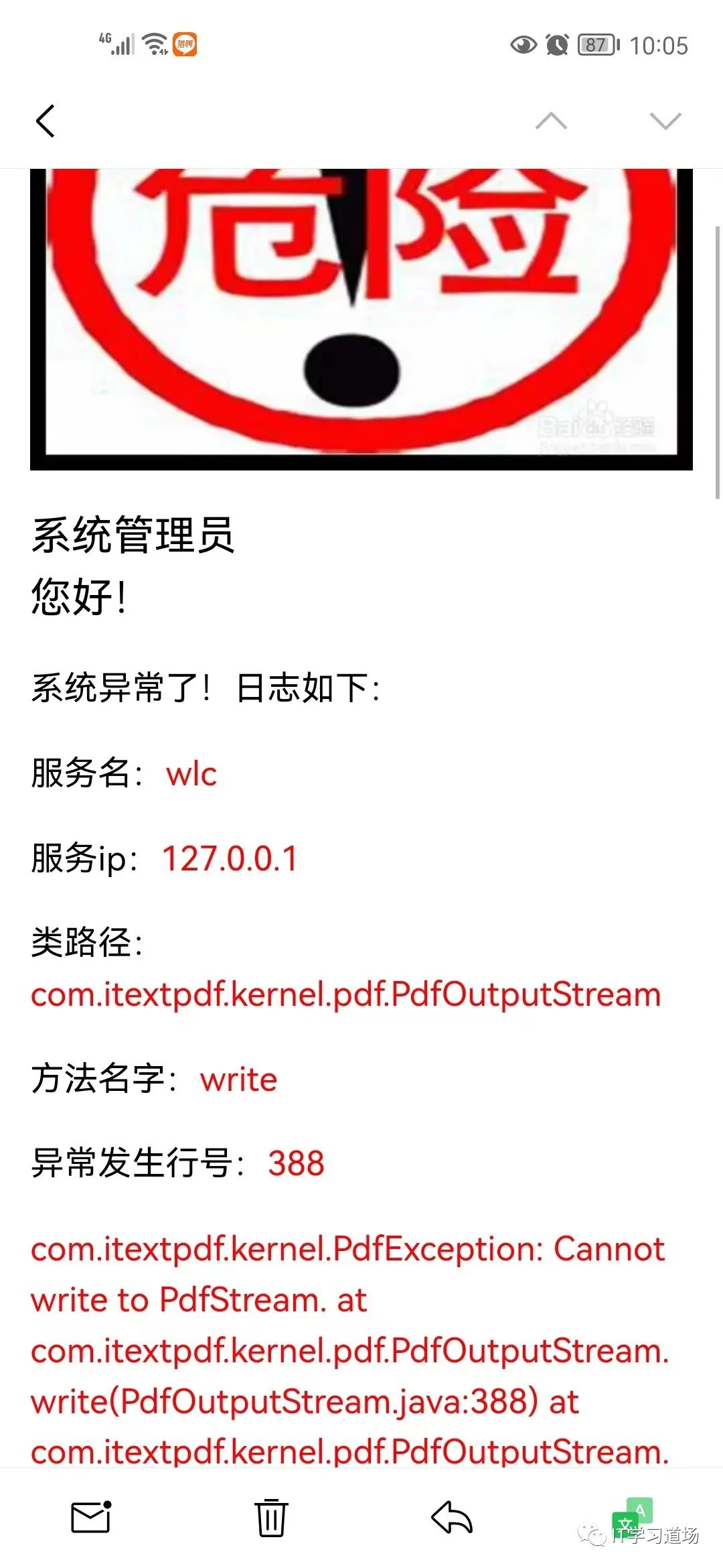 import com.wlc.email.service.EmailService;import org.springframework.beans.factory.annotation.Autowired;import org.springframework.beans.factory.annotation.Value;import org.springframework.scheduling.annotation.Async;import org.springframework.stereotype.Component;import javax.servlet.http.HttpServletRequest;import java.util.HashMap;import java.util.Map;/*** 描述: email处理类 <br>* 时间: 2022-07-01 11:11 <br>* 作者:IT学习道场*/@Componentpublic class EmailHandler {@Autowiredprivate EmailService emailService; // 自定义邮件starter里的 EmailService@Value("${spring.application.name:no-service}") //服务应用没名字private String appName;@Value("#{'${spring.mail.toEamils:}'.split(',')}") //邮件接收者的邮箱数组private String[] toEamils;/*** 异步发送邮件* @param stackExceptionMsg 栈异常信息 str* @param e 异常对象* @param request request*/@Asyncpublic void sendExceptionEmail(String stackExceptionMsg,Exception e, HttpServletRequest request){//根据异常对象和request组装EmailExtendContentEmailExtendContent emailExtendContent = new EmailExtendContent(e, request);//组装渲染数据dataMap<String, Object> data = builderData(appName, emailExtendContent, stackExceptionMsg);//发送邮件emailService.emailSendHtmlByTemplatePath("美术传媒系统异常报告", "notice.ftl", data, toEamils);}private Map builderData(String appName, EmailExtendContent extendContent, String content){Map<String, Object> data = new HashMap<>();data.put("appName", appName);data.put("ipAddr", extendContent.ipAddr);data.put("className", extendContent.className);data.put("methodName", extendContent.methodName);data.put("lineNumber", extendContent.lineNumber);data.put("content", content);return data;}}