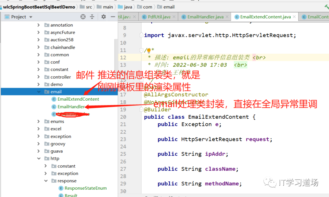 import com.utils.IPUtil;import lombok.AllArgsConstructor;import lombok.Builder;import lombok.Data;import lombok.NoArgsConstructor;import javax.servlet.http.HttpServletRequest;/*** 描述: email的异常邮件信息组装类 <br>* 时间: 2022-06-30 17:03 <br>* 作者:IT学习道场*/@Data@AllArgsConstructor@NoArgsConstructor@Builderpublic class EmailExtendContent {//异常public Exception e;//请求requestpublic HttpServletRequest request;//ip地址public String ipAddr;//类命public String className;//方法名public String methodName;//发生异常的行号public int lineNumber;public EmailExtendContent(Exception e, HttpServletRequest request) {this.e = e;this.request = request;handler();}void handler(){StackTraceElement stackTraceElement = e.getStackTrace()[0];// 获取类名ipAddr = IPUtil.getIpAddr(request);className = stackTraceElement.getClassName();methodName = stackTraceElement.getMethodName();lineNumber = stackTraceElement.getLineNumber();}}