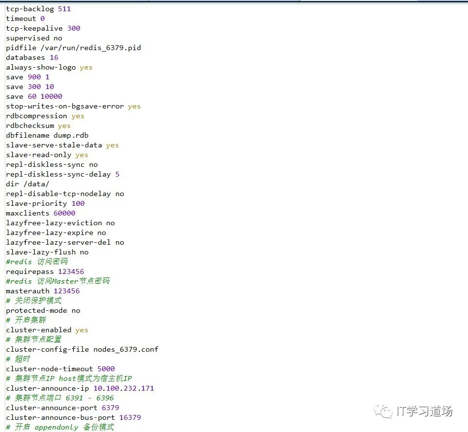 bind 0.0.0.0# redis端口port ${PORT}tcp-backlog 511timeout 0tcp-keepalive 300supervised nopidfile var/run/redis_${PORT}.piddatabases 16always-show-logo yessave 900 1save 300 10save 60 10000stop-writes-on-bgsave-error yesrdbcompression yesrdbchecksum yesdbfilename dump.rdbslave-serve-stale-data yesslave-read-only yesrepl-diskless-sync norepl-diskless-sync-delay 5dir data/repl-disable-tcp-nodelay noslave-priority 100maxclients 60000lazyfree-lazy-eviction nolazyfree-lazy-expire nolazyfree-lazy-server-del noslave-lazy-flush no#redis 访问密码requirepass 123456#redis 访问Master节点密码masterauth 123456# 关闭保护模式protected-mode no# 开启集群cluster-enabled yes# 集群节点配置cluster-config-file nodes_${PORT}.conf# 超时cluster-node-timeout 5000# 集群节点IP host模式为宿主机IPcluster-announce-ip 10.100.232.171# 集群节点端口 6391 - 6396cluster-announce-port ${PORT}cluster-announce-bus-port 1${PORT}# 开启 appendonly 备份模式appendonly yesappendfilename "appendonly.aof"# 每秒钟备份appendfsync everysec# 对aof文件进行压缩时,是否执行同步操作no-appendfsync-on-rewrite no# 当目前aof文件大小超过上一次重写时的aof文件大小的100%时会再次进行重写auto-aof-rewrite-percentage 100# 重写前AOF文件的大小最小值 默认 64mbauto-aof-rewrite-min-size 64mbaof-load-truncated yesaof-use-rdb-preamble nolua-time-limit 5000slowlog-log-slower-than 10000slowlog-max-len 128latency-monitor-threshold 0notify-keyspace-events ""hash-max-ziplist-entries 512hash-max-ziplist-value 64list-max-ziplist-size -2list-compress-depth 0set-max-intset-entries 512zset-max-ziplist-entries 128zset-max-ziplist-value 64hll-sparse-max-bytes 3000activerehashing yesclient-output-buffer-limit normal 0 0 0client-output-buffer-limit slave 256mb 64mb 60client-output-buffer-limit pubsub 32mb 8mb 60hz 10aof-rewrite-incremental-fsync yes# 日志配置# debug:会打印生成大量信息,适用于开发/测试阶段# verbose:包含很多不太有用的信息,但是不像debug级别那么混乱# notice:适度冗长,适用于生产环境# warning:仅记录非常重要、关键的警告消息loglevel notice# 日志文件路径logfile "/data/redis.log"