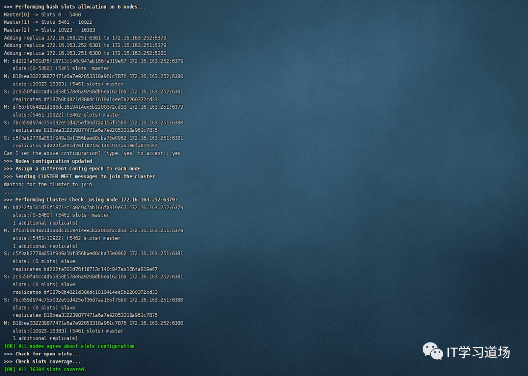 redis-cli -a 123456 --cluster create \10.100.232.171:6379 \10.100.232.171:6380 \10.100.232.171:6381 \10.100.232.172:6379 \10.100.232.172:6380 \10.100.232.172:6381 \--cluster-replicas 1