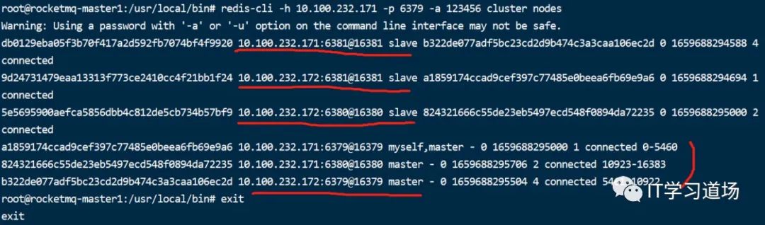 redis-cli -h 10.100.232.171 -p 6379 -a 123456 cluster nodes