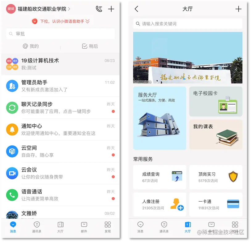 福建船政交通职业学院联合WeLink平台打造校园服务大厅,涵盖教学、科研、生活服务、后勤保障、校园安全等诸多场景,实现了“让信息多跑路,师生少跑腿”。线上服务大厅替代了线下纸质文件的工作流程,及时的提醒通知功能也为申请审批节省了时间。目前已发布包括课程表、电控缴费、人像注册、实验室预约、考试成绩查询等服务。未来,更多部门的在线服务将在此推出。