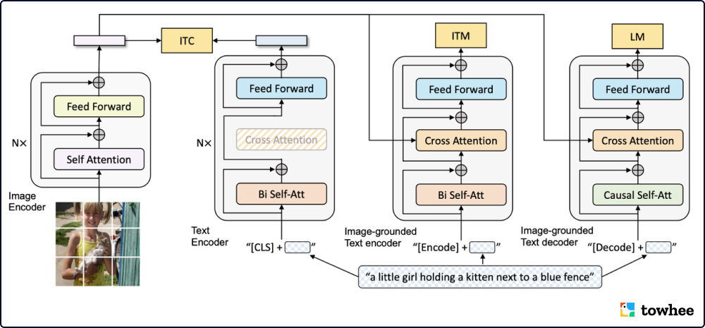 如今大部分文本-图像多模态模型的结构基础大体分为两种,且各自有限制:基于编码器的模型不适用于生成任务,而基于编码器和解码器结构的模型则胜任检索任务。此外,大部分模型所用的数据都来自于网络上的图像文本对,尽管性能收益可以通过扩大数据集的规模得到,但该方法依然存在诸多缺陷。面对这些问题,BLIP 提出一种新的图像文本预训练框架,有效地将自举的方式利用到有噪声的网络数据上。模型使用一个描述器生成文本描述,并且通过一个过滤器清洗数据噪声。