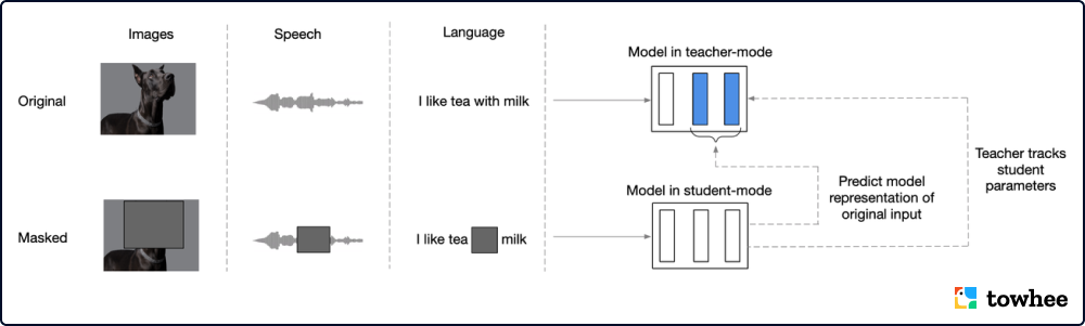 data2vec 将不同模态的输入都转换成了同一种形式的数据序列,基于 transformer 设计了一个教师-学生形式的网络结构。训练时,其核心思路是将数据上进行部分遮盖,用模型生成潜在表示并预测被遮盖的部分。为了避免不同模态之间的差异性,data2vec 并没有使用和模态绑定的重建目标(文本,视觉记号,语音单元),而是选择预测带有上下文的潜在表示。