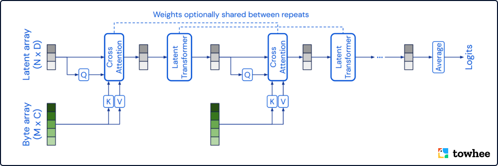 Perceiver⁴ 模型大体由两种基础结构组成:交叉注意力机制(cross-attention)和 Transformer 编码器(latent transformer)。模型将输入的数据按像素层面展开成一维向量,然后将该向量通过 MLP 得到注意力机制需要的 K、V 。另外,模型通过随机初始化得到较小维度的隐向量(latent array),在保证模型复杂度的情况下,可以直接处理任意长的输入,即获得处理不同尺寸图像的能力。最后,通过堆叠多个交叉注意力机制和 Transformer 编码器模块,模型能够充分挖掘输入向量的信息。