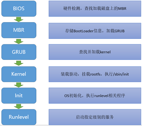 系统的启动过程基本可以分为几个阶段:POST-->MBR(GRUB)-->Kernel-->Init-->Runlevel