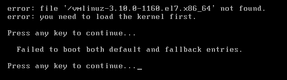 3、 内核文件损坏或丢失,无法正常引导;出现该故障时,启动界面会提示“error: file ‘/vmliunz…’not found”