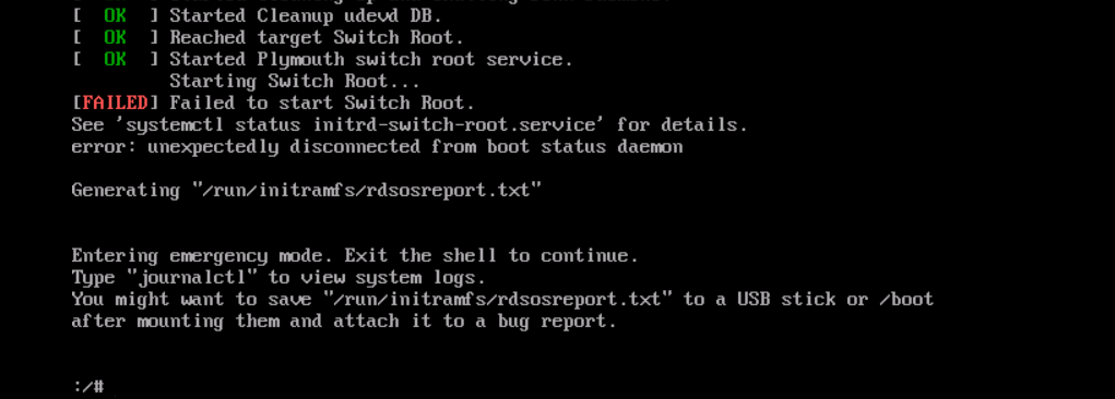 该类故障的各类较多,如出现类似故障,首先要根据启动的服务名,判断该服务是内核空间进程还是用户空间进程,再进入emergency模式,查看启动日志,根据日志针对性排除故障