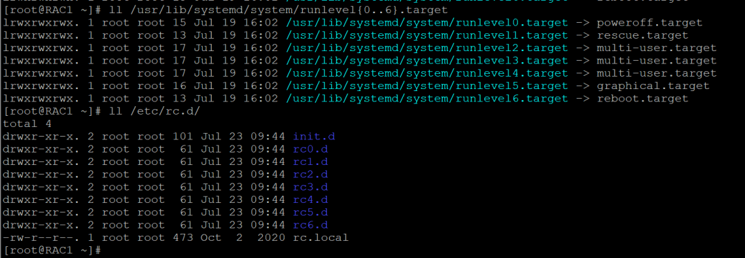 CentOS7上每个启动级别有了新的名字,但其最终的实现方式还是类似的。在/usr/lib/systemd/system/目录下有runlevel{0..6}.target共7个文件,分别对应CentOS6上的0~6启动级别。当系统需要启动指定级别时,即启动该级别对应target单元,启动该级别后,系统运行保存在在/etc/rc.d/目录下指定级别里包含的脚本