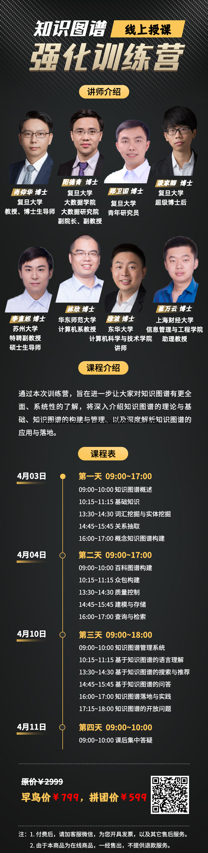 4月3-4日、10日,DataFun联合复旦大学知识工场肖仰华教授团队,为小伙伴们精心设计了一场为期3天的付费线上强化训练营: