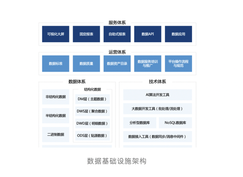 运营体系:通过数据标准、数据质量、数据资产目录、数据服务培训与推广、平台操作流程与规范等,搭建数据的资产化管理与运营体系,从而为服务体系提供稳定的运营支撑,并保证数据基础设施与组织架构之间的协同效率。
