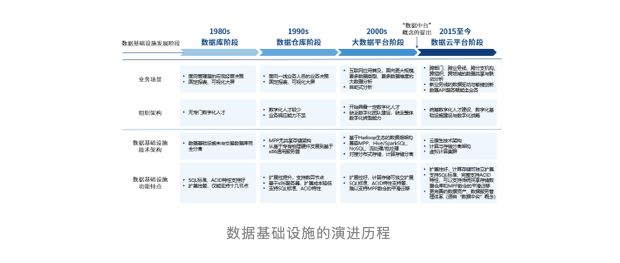 数据基础设施的演进历程,已经经历了数据库、数据仓库、大数据平台三个完整阶段。目前,数据基础设施正在迈向前三个阶段之后的第四个阶段,即“数据云”阶段。