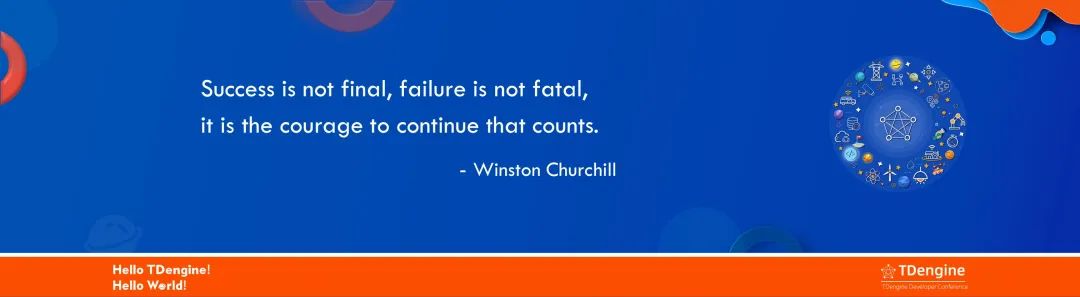 我特别喜欢丘吉尔的这段名言,翻译成中文就是“成功不是终点,失败不是终结,唯有你继续前行的勇气最为关键”。从创建 TDengine 到现在,我们已经走过了 5 个年头,开源也已经走过了 3 年,在这个过程中取得了一些小小的成功,但是我们前面的路还很漫长,我已经做好了再战 5 年、10 年的准备。希望我在七八十岁的时候还能继续写代码,和大家一起讨论问题,度过真正有价值的一生。
