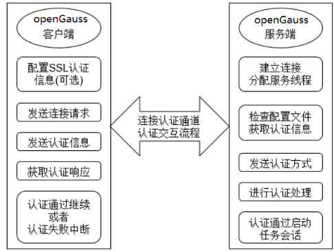 (6)服务端对收到的认证信息进行认证。认证通过,则启动会话任务与客户端进行通信提供数据库服务;否则,拒绝当前连接,并退出会话。客户端安全认证机制是openGauss的第一层安全保护机制,解决了访问源与数据库服务端间的信任问题。通过这层机制可有效拦截非法用户对数据库进行恶意访问, 避免后续的非法操作。