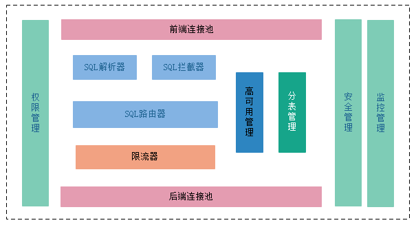 本文采用限流、超时SQL拦截的手段来保证MySQL服务的高质量,但MySQL数据库本身或现有集群模式并没提供这种能力。因此需设计一个数据库中间件来提供这种能力,事前杜绝这些隐患,保证后端MySQL服务的高质量。下图为数据库中间件产品的主要功用模块,简单说明以下几个: