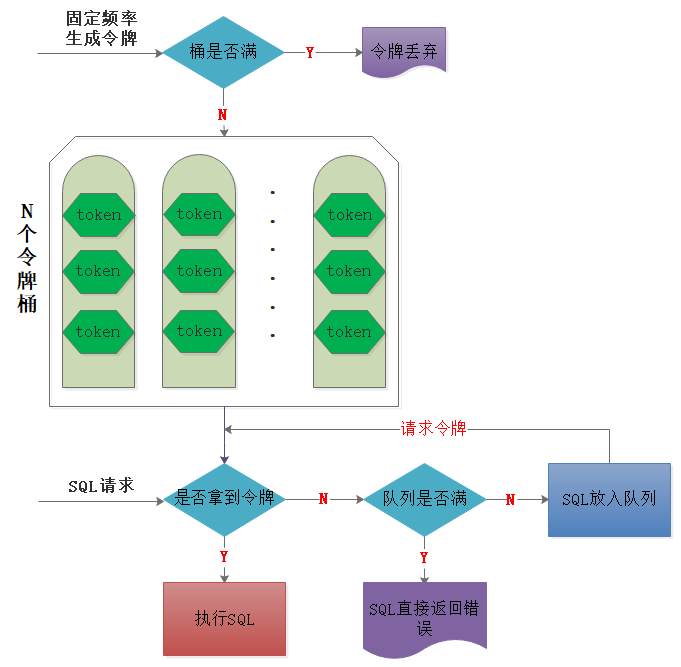 客户端请求的SQL经过解析后,由SQL路由器转发至某一个后端MySQL节点时,请求相应令牌桶中的令牌,请求满足,则执行相应SQL