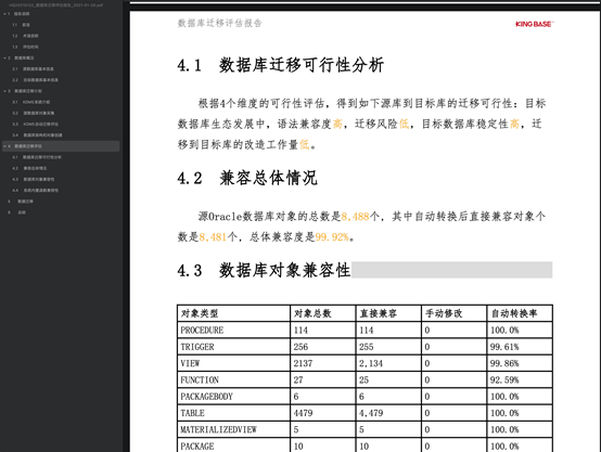 KDMS系统可以通过对源数据库的信息采集,快速实现对应用迁移的综合评估,为用户提供辅助迁移决策及指导应用迁移工作的《迁移评估报告》。该报告可提供应用迁移工作相关量化指标数据,帮助用户提前识别迁移风险,提升迁移效率,最大化降低用户的数据库迁移成本。