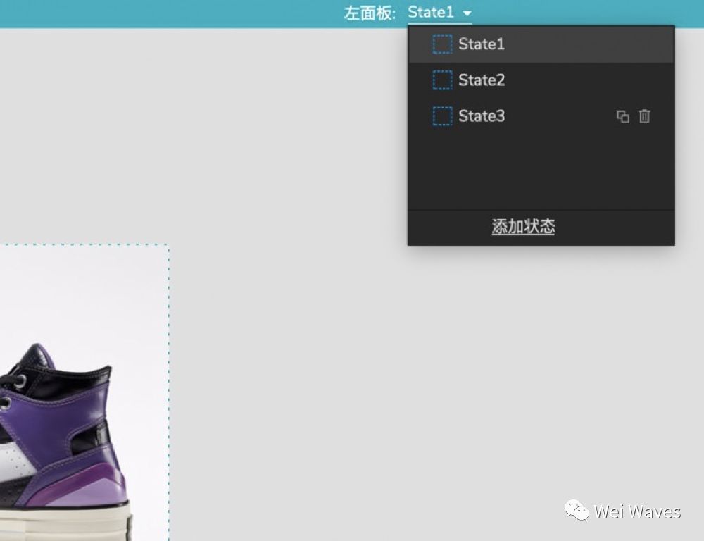 a.添加三个状态将后两张图片依次放入状态2、3,并将该面板命名为左面板2(后面要在该面板之上再放置一个动态面板命名为左面板1)