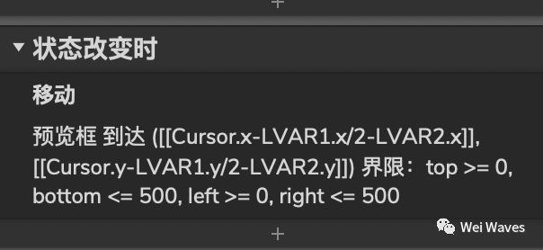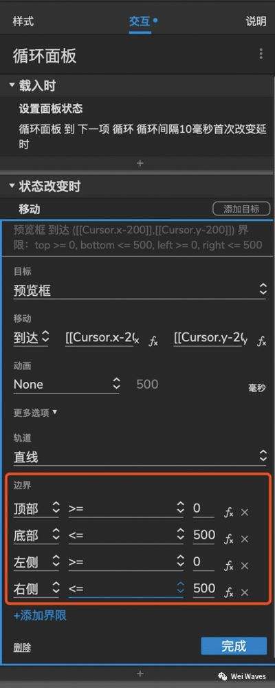 3.在上述操作后添加预览框移动的边界,也即不要超出左面板1的范围,左面板作为一个500*500大小的动态面板其范围如下图