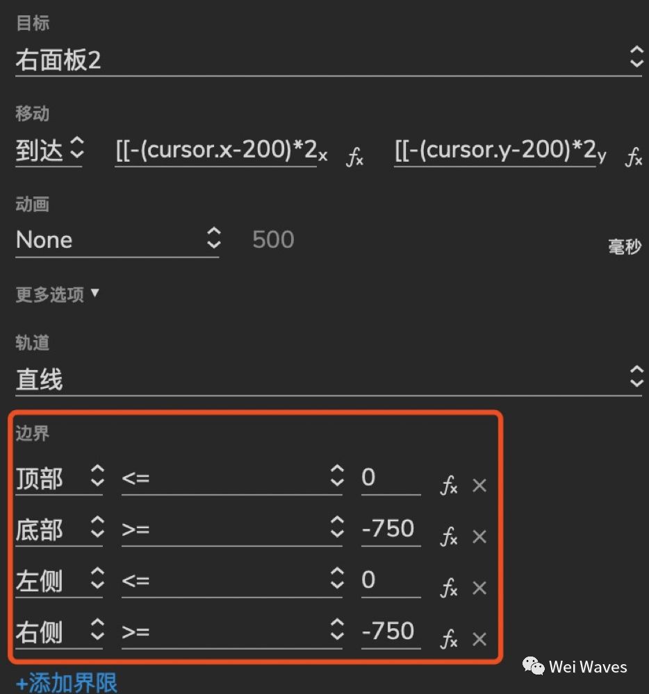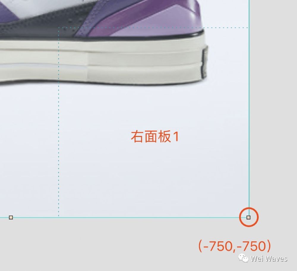 Tip:因为右面板1尺寸为500*500,再加上右面板2为反向移动,所以右面板2的底部>=-750,右侧>=-750,顶部和左侧<=0即可。