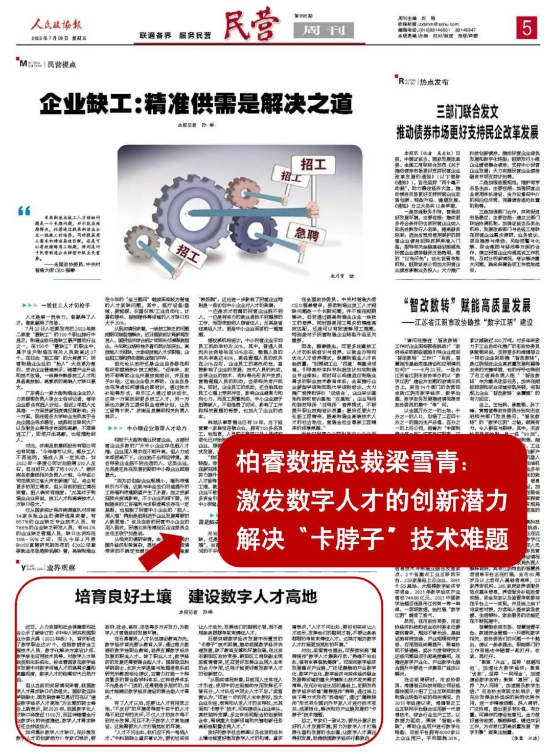 2022年7月29日《人民政协报》05版关注数字经济人才发展,针对我国数字人才需求缺口较大的问题,对北京市朝阳区政协常委、朝阳区工商联副主席、柏睿数据总裁梁雪青进行了专访。