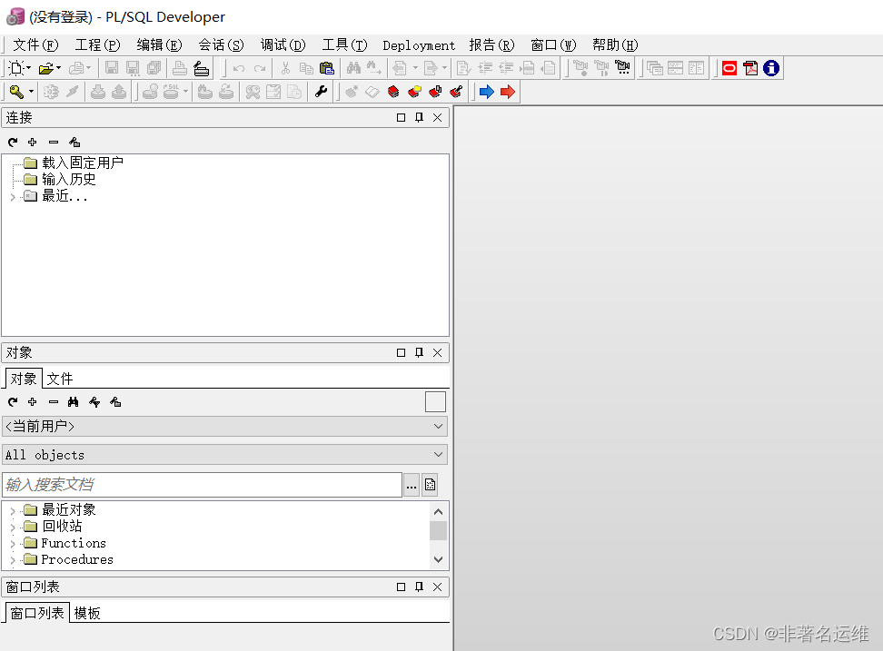 将弹出的错误框直接叉掉,会进入PLSQL工具的主界面,我们需要进行一些配置。