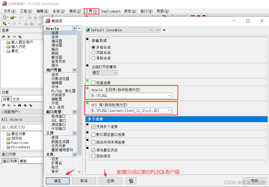 配置完成后,重启PLSQL客户端,再重新登录即可(上面的路径根据自己的PLSQL工具安装位置、轻桌面工具包解压路径修改)。