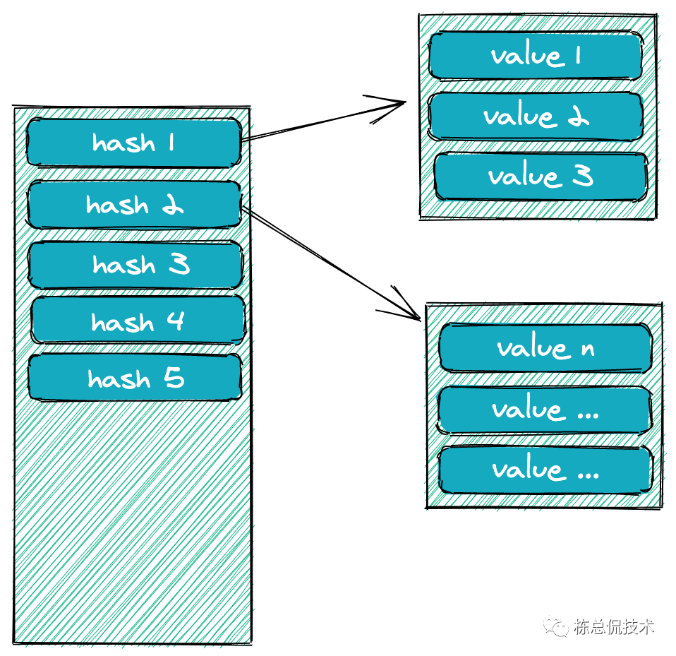 哈希表是一种key-value键值对的存储数据结构。当数据量比较大时,不可避免的出现多个key哈希的结果是相同的,这个时候会拉出一个链表来存储多个value。下图就是哈希表的存储结构: