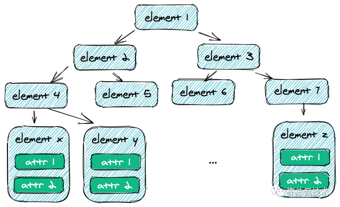 二叉树的特点是左子节点的值都小于父节点,右子节点的值都大于父节点。如下图如果需要找到elementx,则需要经过1->2->4->elementx,时间复杂度是 O(log(N))。