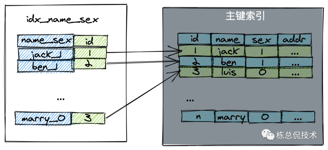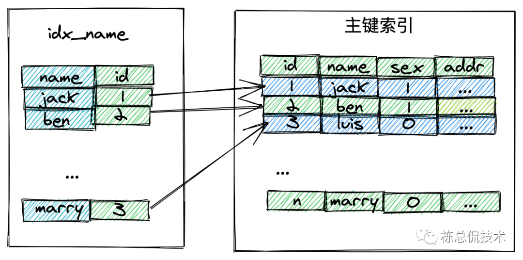 普通索引,先从索引表获取jack这个学生的id,然后再到主键表通过id查找所要的信息再返回: