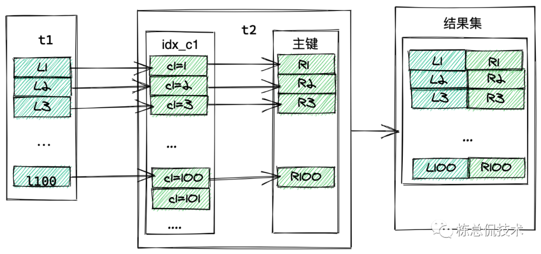 取出L的c1字段到表t2的索引表找到c1