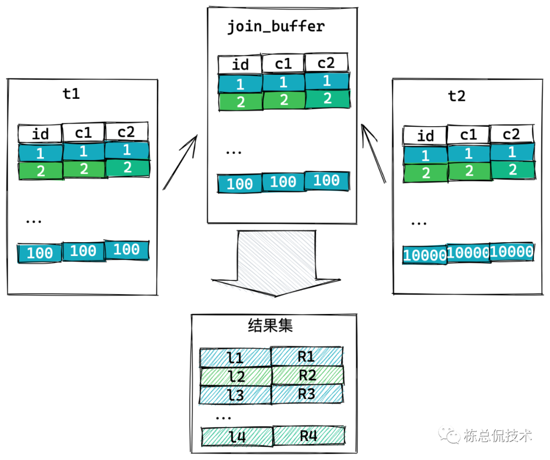 扫描t2,把满足join条件的行和join_buffer中的t1的行存入结果集