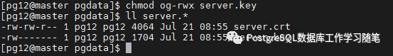 在 Unix 系统上,server.key上的权限必须不允许所有人或组的任何访问,通过命令chmod 0600 server.key可以做到。或者,该文件可以由root 所拥有并且具有组读访问(也就是0640权限)。这种设置适用于由操作系统管理证书和密钥文件的安装。用于运行PostgreSQL服务器的用户应该被作为能够访问那些证书和密钥文件的组成员。
