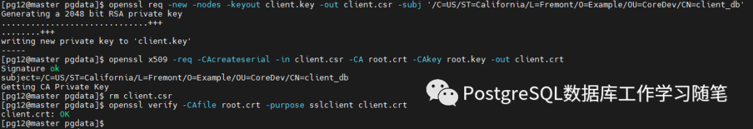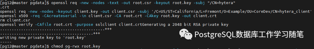 拷贝client.crt client.key root.crt到客户端,对client.key赋权0600: