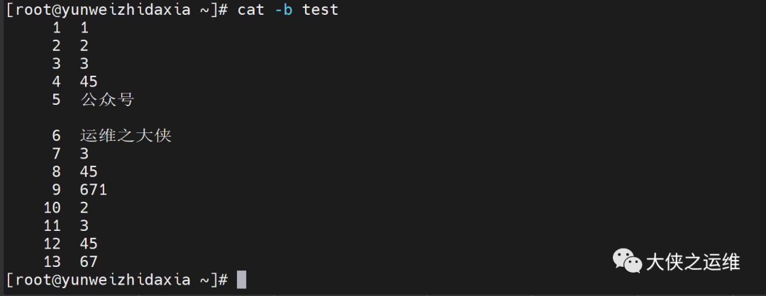 -b 或 --number-nonblank:和 -n 相似,只不过对于空白行不编号。