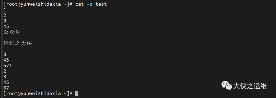 -s 或 --squeeze-blank:当遇到有连续两行以上的空白行,就代换为一行的空白行。