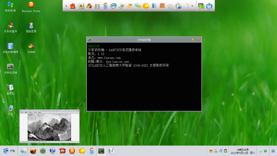 真实的Laxcus桌面应该是上面这个样子,它不是简单的MacOS桌面复制品,更多是借鉴了Windows和MacOS桌面之后的自主创新。这些可以见到的元素包括:图形桌面是以图标化的图示为主,有意减少文字描述。桌面底部是任务栏,任务栏左侧是启动按纽,点击后会弹出启动菜单。右侧是一组系统图标,中间显示运行中的应用软件。托盘应用图标被集中放置在托盘面板上,点击任务栏上的系统托盘图标,托盘面板会在任务栏上方显示,再次点击就被隐藏起来,这个设计极大减少了托盘应用占用应用软件的空间。应用坞(DOCK)可以在桌面上移动,在任何位置显示或者隐藏起来。图形窗口采用了扁平化加细边条的设计风格,最大化展示窗口内容,窗口右上角使用了红绿黄三色灯设计,保证有醒目的外观。系统还为运行中的应用软件提供快照功能,将鼠标移到任务栏的应用软件上,系统会弹出一个悬浮窗口,显示应用软件在后台的运行状态。图形桌面还使用了磁吸式设计,鼠标拖动桌面上的应用图标,桌面预显示对齐位置,释放鼠标后应用图标自动对齐,保证桌面上的应用软件排列整齐美观。