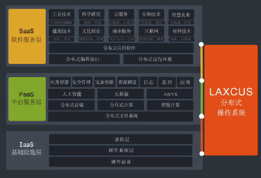 这是Laxcus分布式操作系统对标云计算三层的结构图,Laxcus分布式操作系统最初是以云计算三层为参考模型设计开发而来。在IaaS基础层提供基础计算环境和虚拟化能力,在PaaS平台层提供数据、计算、管理相关的业务接口和服务,在SaaS软件层对接分布式应用软件,提供分布式应用软件编程开发和运行环境。