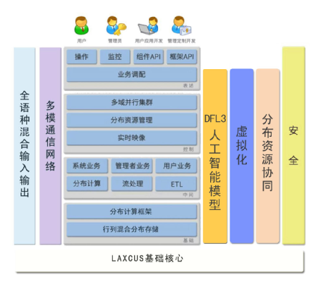 4.人工智能:目前主要提供DFL3人工智能模型,这是一个小样本深度学习模型,已经应用在计算机集群的智能化管理、故障实时感应、数据流量的分配和控制上。在Laxcus分布式操作系统里,人工智能的产品定位是辅助分布式应用软件,在执行分布式存储和分布式计算时,解决应用业务智能化决策判断处理的问题。