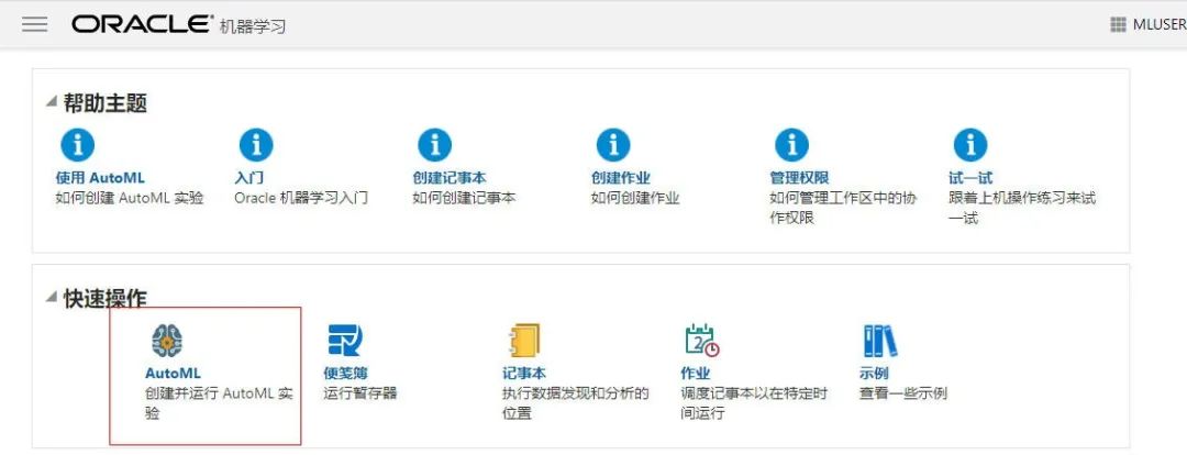 访问ADW提供的基于web的Machine Learning图形化界面,在首页中,可以看到快速操作中增加了AutoML图标,通过点击autoML图标,打开AutoML界面。