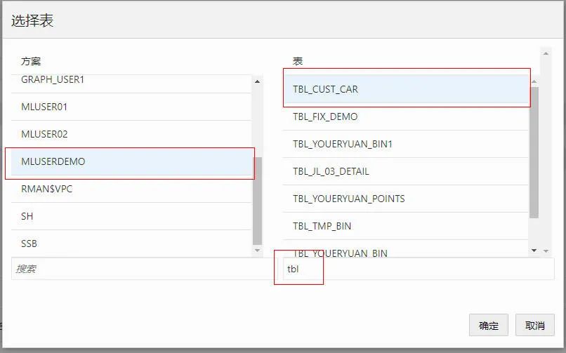 数据源界面中左边显示的是ADW数据库的Schema,选择特定Schema,右边显示Schema下所有表,可以通过下方输入框输入表名前面字符过滤,在这个例子中,我们选择的是TBL_CUST_CAR表,这个表中存储的是客户购买车型的历史信息。