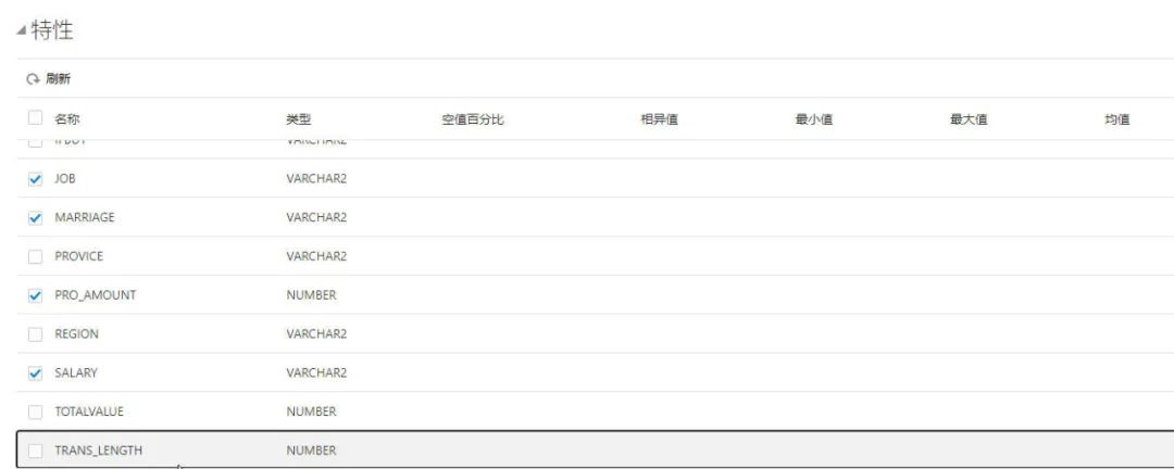 点击“特性”部分,可以显示数据源表的所有列,我们可以从中选取哪些列作为学习的输入参数,有时候不是表中的所有列都适合作为参数学习建模,例如有些和结果关系不大,比如姓名,或者和结果强相关,例如购买金额(这个是购买车型造成的结果)