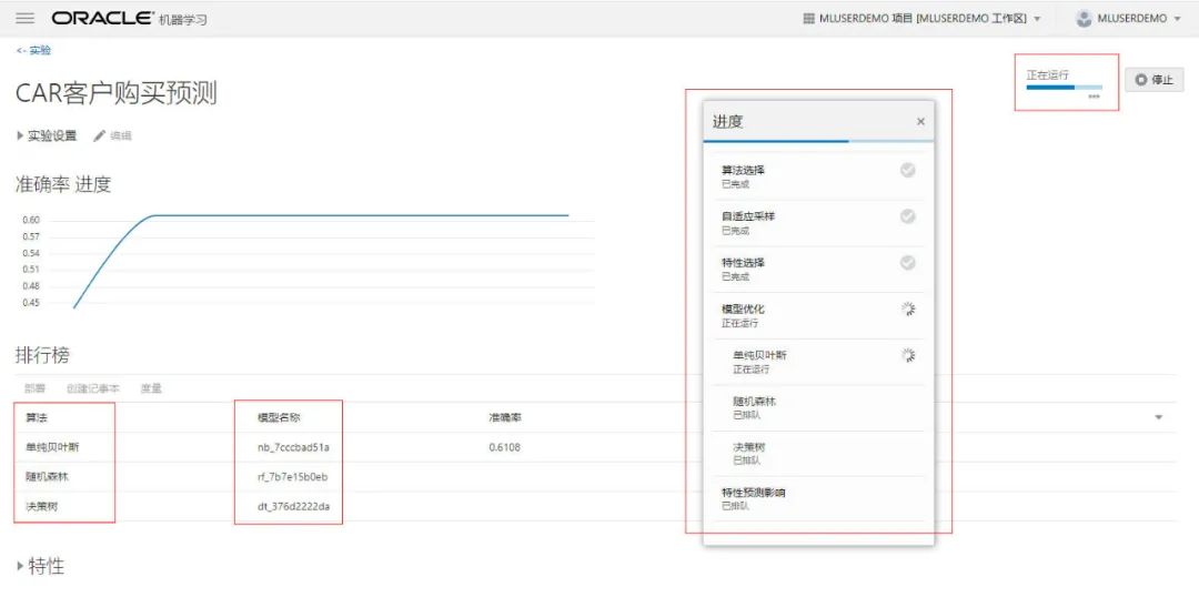 可以看到进度分为“算法选择”,“自适应采用”,“特性选择”,“模型优化”,“特性预测影响”几个步骤,随着执行情况,弹窗内容会更新,能够看到执行到了哪个步骤。如下界面显示已经到了“模型优化”阶段,左边准确率进度会显示选择了哪几种算法,每个算法的准确率情况如何。