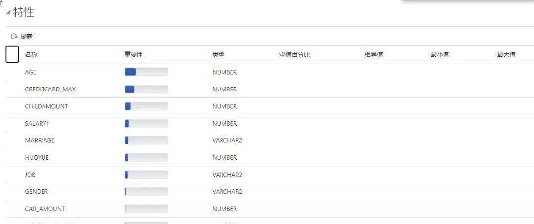 当弹窗中所有项目后面图标变成对号,右上角“正在运行”变成“已完成”时,说明已经运行完毕,可以看到系统按照配置,自动选择了三种算法,生成了三个模型,模型名称是算法加上随机数格式,同时显示了每种模型的准确度,在这个例子中,单纯贝叶斯算法生成的模型准确度最好,可以点开“特性”部分,看到选择的表中各列对模型预测的影响,如下图所示,在这个例子中,年龄,可贷款的最大额度,孩子数量是影响购买车型的前三个主要因素。