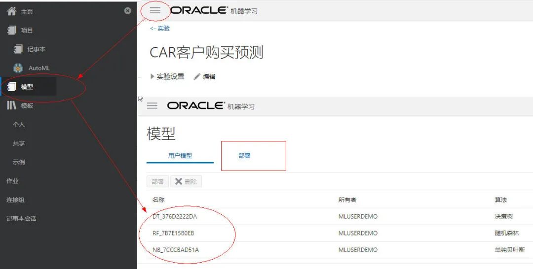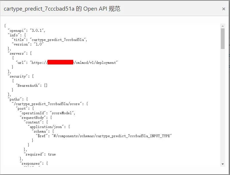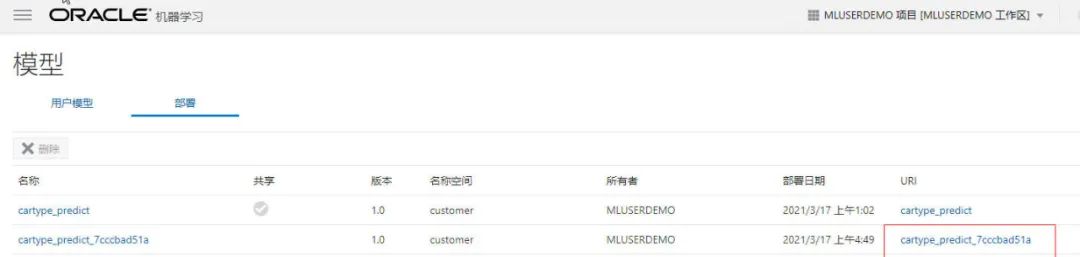 点击“部署”可以看到刚才自动化生成的模型部署,点击后面URI下方的链接,能够浏览该模型的API具体调用信息(这部分REST API的调用,后面我们会在Oracle Machine Learning Service中详细介绍):