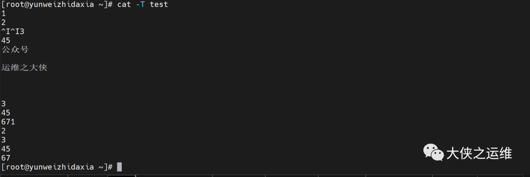 -T 或 --show-tabs: 将 TAB 字符显示为 ^I。