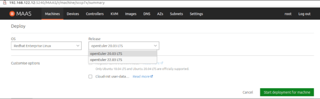 MAAS使用curtin 解压上传到 MAAS 的 openeuler 映像并在 MAAS 部署期间安装 grub程序等。cloud-init 则是在 MAAS 部署后的首次启动期间来初始化机器,比如机器名,网络地址,注入ssh pub key等。cloud-int所使用的user-data由MAAS管理及自动提供。如果没有上面的临时解决方法将openeuler 映像假装为rhel, 则在部署时会出现如下2个报错。更详细信息及问題跟踪可访问: https://bugs.launchpad.net/curtin/+bug/1975922
