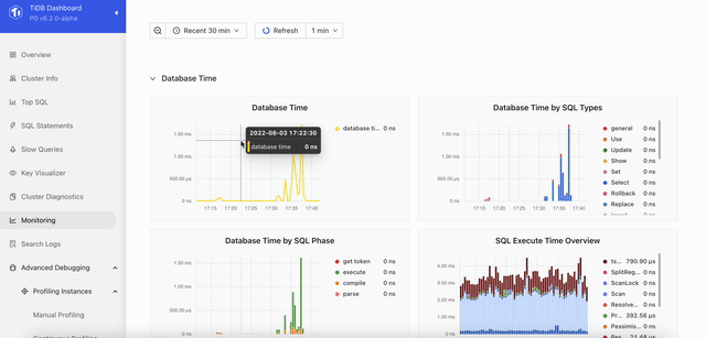 在这个版本中,TiDB Dashboard 也新增的 Monitoring 页面,展示了在业务性能调优中所需的核心指标,使得用户大部分的日常运维监控需求可以在这里完成,无需在 Grafana 和 Dashboard 间跳转。