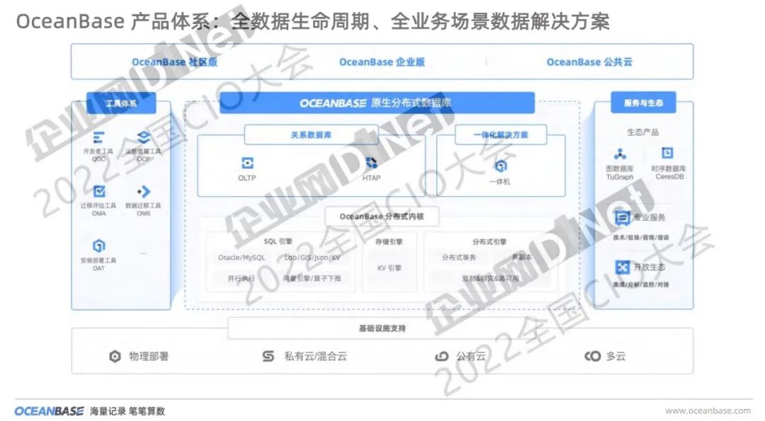 7月23日,在由企业网D1Net、信众智(CIO智力输出及社交平台)主办的“2022全国CIO大会”上,蚂蚁集团数据库产品负责人、OceanBase解决方案和产品总经理师文汇,发表主旨演讲《OceanBase助力企业数字化转型》并表示:目前业界正在发生的趋势是,包括蚂蚁金服合作的很多企业最开始有80%的业务跑在传统数据库和存储上,现在已经逐步切换到OceanBase等分布式数据库上。