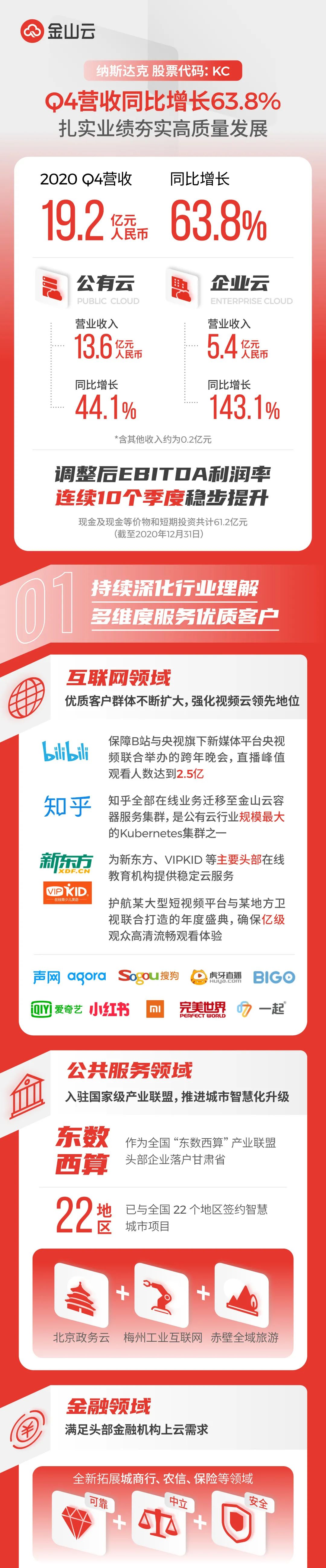 2020年第四季度,金山云(NASDAQ:KC)总营收19.2亿元,同比增长63.8%。全年营收65.8亿元,同比增长66.2%,收入增速远高于公有云行业平均水平。本季度,金山云持续提升核心产品和技术能力,在互联网、公共服务、金融、医疗等垂直行业精准布局,中立云服务商优势凸显,优质客户群体不断增加,带动各项业务扎实稳健增长。未来我们将充分发挥云原生体系的优势,在深度满足已有客户需求的同时,持续拓展优质新客户,助推公司高质量发展。奉上长图,带你看懂金山云2020年Q4季度财报